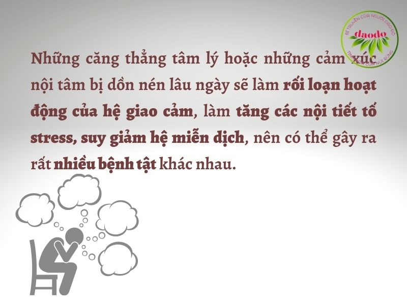 Những nghiên cứu về hệ quả stress của khoa học ngày nay cũng cho thấy những căng thẳng tâm lý hoặc những cảm xúc nội tâm bị dồn nến lâu ngày sẽ làm rối loạn hoạt động của hệ giao cảm, làm tăng các nội tiết tố stress, suy giảm hệ miễn dịch, nên có thể gây ra rất nhiều bệnh tật khác nhau.