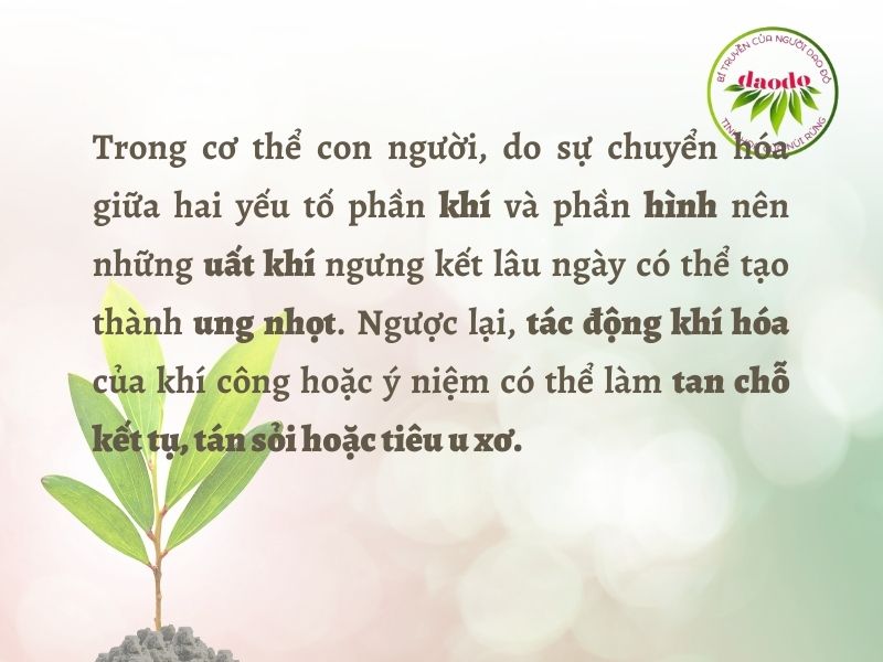 Trong cơ thể con người, do sự chuyển hóa giữa hai yếu tố nên những uất khí ngưng kết lâu ngày có thể tạo thành ung nhọt. Ngược lại, tác động khí hóa của khí công hoặc ý niệm có thể làm tan chỗ kết tụ, tán sỏi hoặc tiêu u xơ.