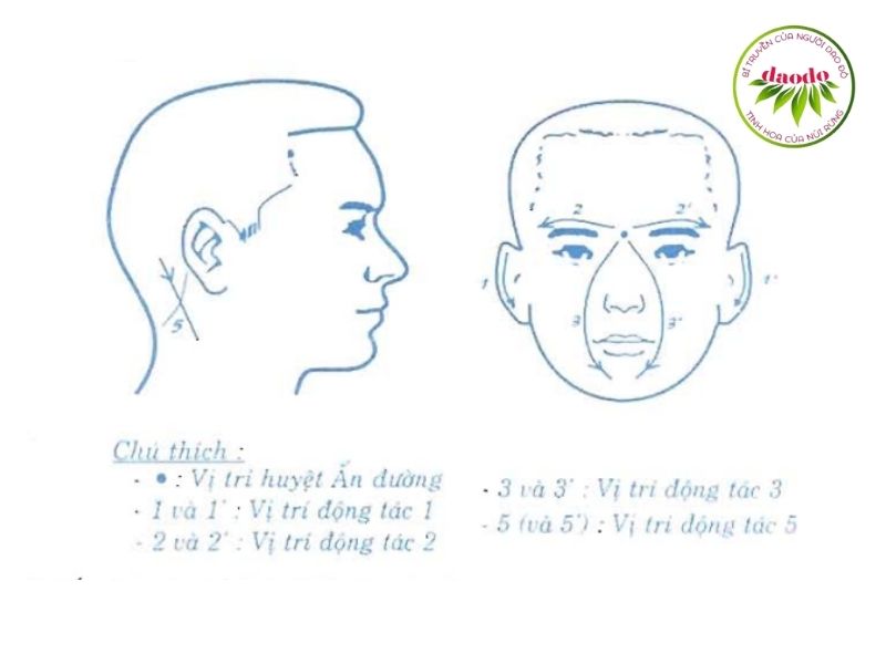 4. Day ấn huyệt Ẩn đường: Dùng ngón trỏ của bàn tay phải ấn nhẹ vào điểm giữa hai chân mày trong vài giây, day thành vòng tròn chung quanh điểm này khoảng 21 vòng. Khi tác động vào huyệt An đường, cơ thể sẽ tiết ra chất Endorphine nội sinh, có tác dụng làm giảm đau, giáng khí và an thần.